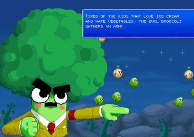 The evil Broccoli, irritated by the fact that kids hate vegetables and love ice creams, has created an army of vegetables to destroy the flavor galaxy. Only the Ice Cream Surfer with the help of his 4 super tasty friends can prevent that.